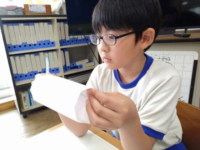 子どもは立体を身のまわりで探す中で、子どもは立体を自分でつくりたいと思いをもちました。子どもは、組み立てたときに思い通りの形になるかワクワクしながら、設計を展開図として描きました。組み立てながら、面が集まってできる形が立体であることを改めてとらえ、面の形や大きさなどを考えながら設計しました。