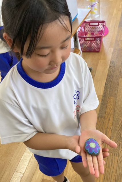 実際に絵が描かれた石を見て、「きれいだね」「私も石に絵を描いてみたいな」と言う子どもがたくさんいました。