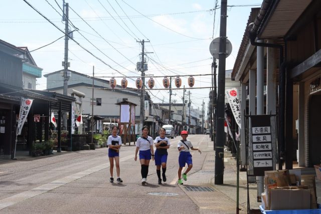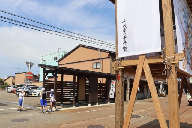 大町4丁目から5丁目に向かって歩きました。駅前通りを渡り、大町5丁目に近づいていくと「かぼちゃ祭」と書かれた幟旗が道の両脇に掲げられている様子が目に入ってきました。さらに進むと「大町五」と書かれた提灯が見えてきました。それらの様子を見た子どもは、「いつもと違うね」「祭って感じの雰囲気」と言いました。