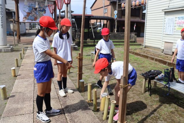 早速竹灯籠を並べてみました。「バランスよく並べたい」と話す子どもがいたことから、間隔を見ながら竹灯籠を試しに置いてみました。
