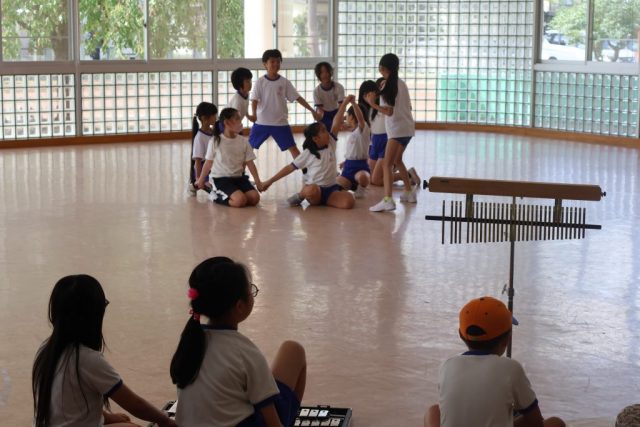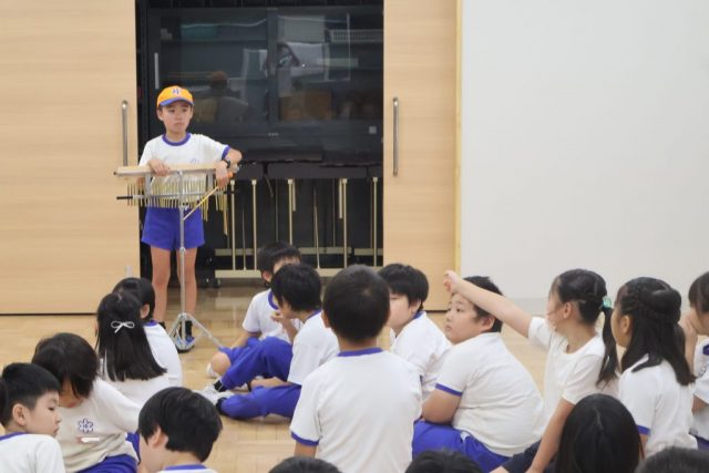 2つの歌い始めの合図が決まったことで、早速「えんじ、歌職人」の子どもとツリーチャイムとグロッケンを担当する「音職人」の子どもで合わせてみました。子どもは「歌い始めがわかりやすくなった」と話し、大きな声で歌い始めるようになりました。9月29日には、3つの職人の表現を合わせて、最後まで通すこともできました。子どもは、自分の選んだ職人の表現をつくる楽しさや難しさを感じながら、仲間と表現を合わせてミュージカルをつくり、自分の表現をつくり変えています。