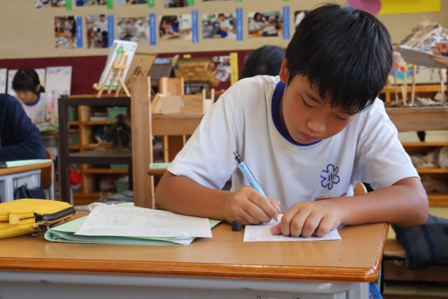 子どもが物語の書かれ方について違和感をもっていることをとらえた教師は、「作者は、春花が考えた子馬の名前を出した方がよかったですか」と問いました。子どもは、「出してもらわないと、モヤモヤするし、イライラする」などと、子馬の名前を出した方がよかったと、物語からありのままに感じたことを話しました。それとともに、「作者は、名前をわざと出さないで書いているんだと思う。出さないから、読む人に気にならせて、その後の話や名前も想像できる」「名前を出したら、勇太や陸が子馬の名前を分かるから『もう、いいや』ってなって、紙で折った子馬を渡すことにつながらない。物語が成り立たない」などと話しました。また、一人一冊持っている手帳に、「子馬は、勇太と春花の距離が近づくためのトリガー」「子馬の名前が分からなかったから、2人の友情が深まった」と書く子どももいました。子どもは、問いにはたらきかけられながら、物語において子馬の名前を出さなかった作者の意図、物語の書かれ方のよさを見いだしました。