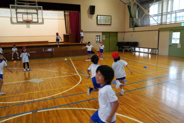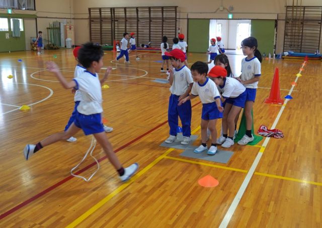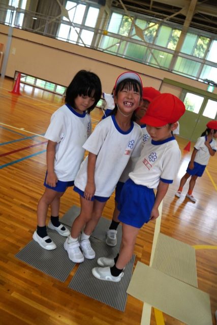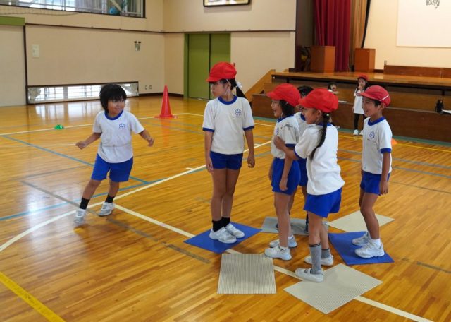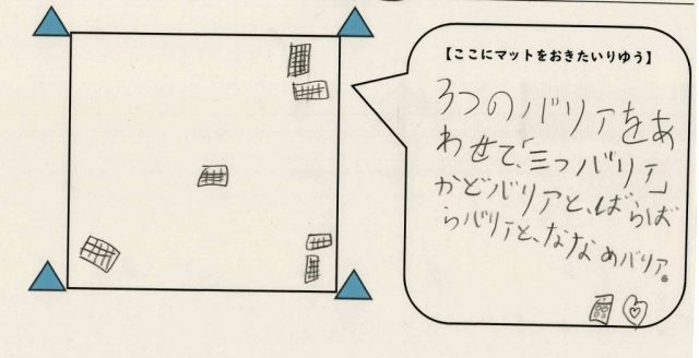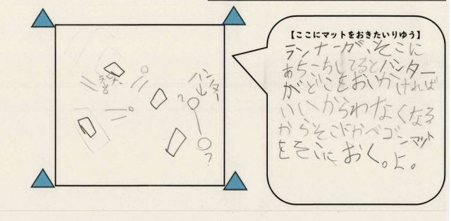 ○かどバリア・・・コートのすみにマットを二つ置きます。子どもは、少ない人数でバリアを作れること、ハンターが一度止まらせることができることがよいと話しました。
