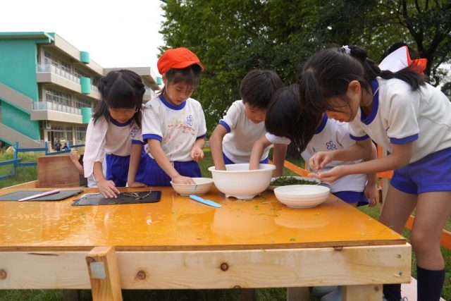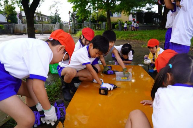 テーブルができたことに合わせて、とことこランドに前庭のベンチを移動する子どももいました。