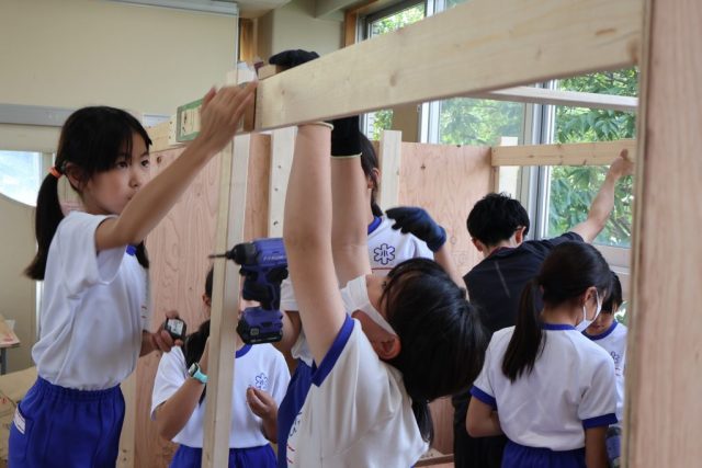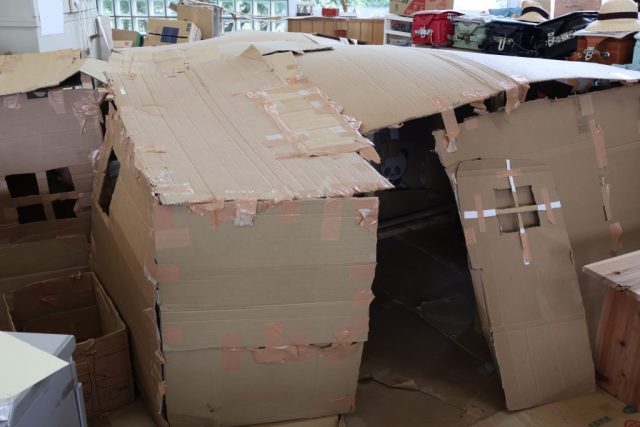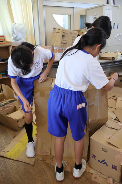 学級の仲間にその思いを伝えると、よりびと駅はダンボールだから壊れやすい、待合室しかない、駅が小さくて中で立てないなど、子どもは、これまでよりびと駅を使ってきたことから感じていた問題点を話しました。そして、一度、解体して、よりびと駅をつくり直すことが決まりました。