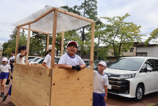子どもは、1学期に木の電車「よりびと号」をつくりました。