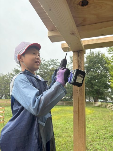 屋根が完成する日は、ちょうど雨が降っている日でした。子どもは、「ちょうどよかった!」と笑顔で話しました。