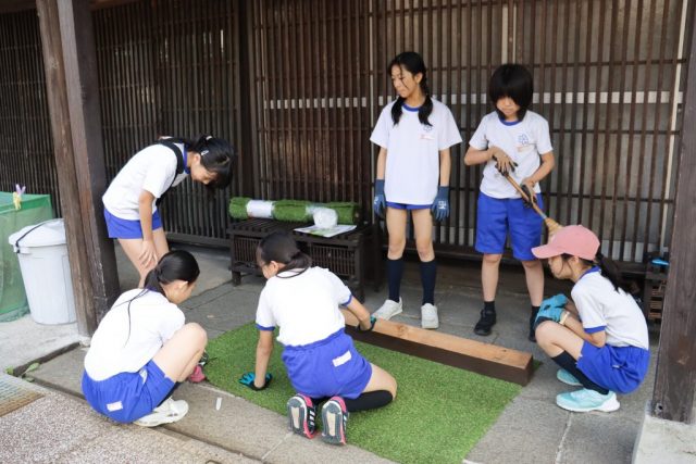 「竹とうろうを置くところを作りました。地面に人工しばをしきました。かくざいのところも人工しばをうってつけました。しばをしくとき、地面がきたなかったので小林さんにそうじセットをかりてきれいにしました。すると他にもきたないところがあってとまらなくなってきました。今度いく時はそうじもしたいです。」