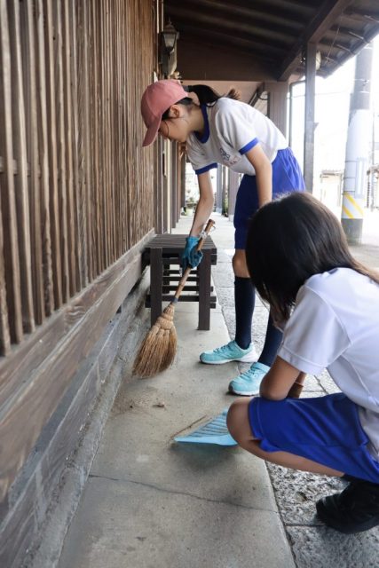 石畳に人工芝に置こうとするも汚れていることに気付きました。「掃除したい」「でもほうきとかちりとりがないね」と話しました。「小林さんに聞いてみよう」と言い、小林さんのところへ行くとほうきとちりとりを貸してもらいました。早速、掃除をすると雁木下がきれいになりました。