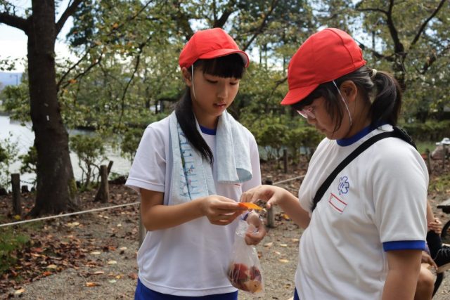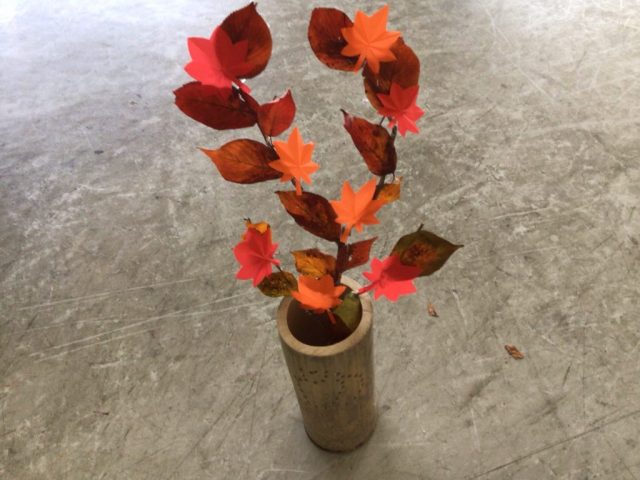 子どもは、10月18日(土)に大町通りで行われる「町家と雁木のマルシェ」で小林さんから竹灯籠を飾らせてもらえる許可をもらいました。また、これまで、創造活動「いきづく大町通り」で、竹灯籠に何かを入れて大町通りに飾ることを話してきました。何を入れるか考えた際、木の枝に落ち葉を貼り、飾ることにしました。また、折り紙でもみじなどを折って貼りたいと考える子どももいました。
