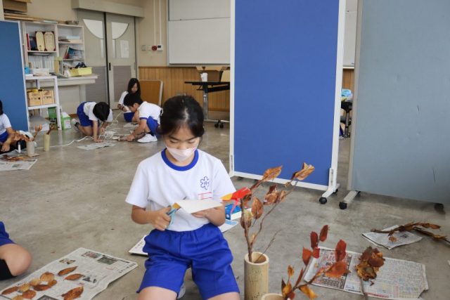 学校へ戻ると葉っぱの汚れを取ったり、辞書などを上に置いてしわを伸ばしたりしました。また、原っぱへ自分の竹灯籠に合う枝を探しに行きました。