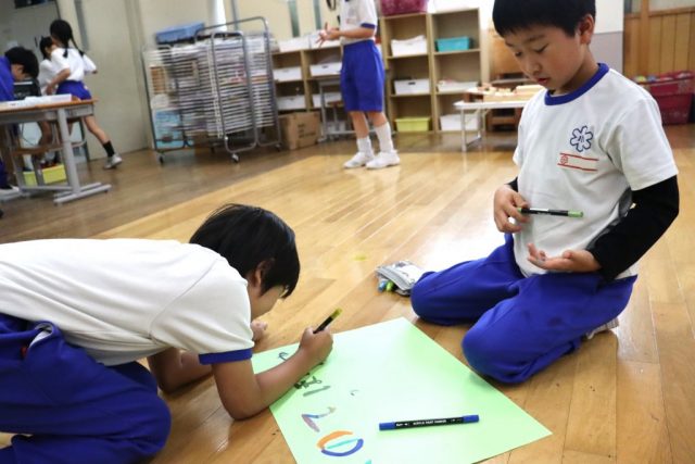 「今日、オープンのじゅんびをしました。ほんちょうハロウィンの手づくりマーケットの写真をとりました。ぼくは、〇〇くんと写真をとりました。木のころがしゲームをしている時と、じゅうをとりました。大きいじゅうをギリギリで木のころがしゲームに立たせて、ちょうどいい感じにしました。投げてすぐ写真のところからよけました。いい感じになって、それをほんちょうハロウィンのチラシにのせました。ワクワクします。次は、かんばんをつくりました。今日は2モジュールあるからジャンジャンつくっていきます。かんばんは、注意じこうを書きます。そうしたら、絵をかきました。じゅうの絵をかきました。けっこういい感じになった気がします。」