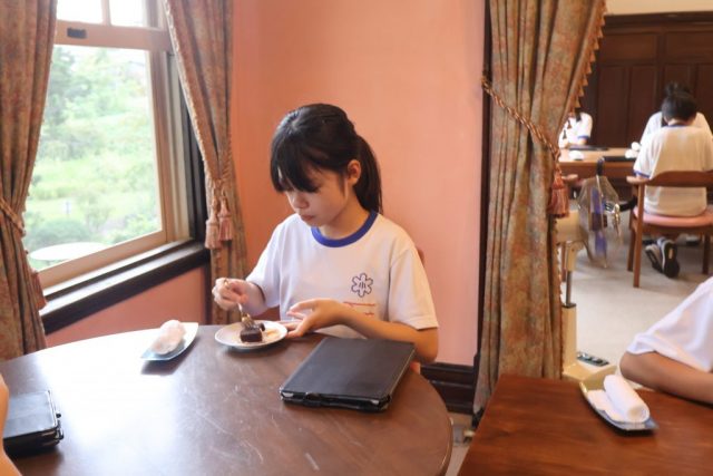 見学の後は、レストランエリスのカフェで提供されているケーキをいただきました。「高級な味がする」「特別な日のためがわかる」と話す子どもがいました。