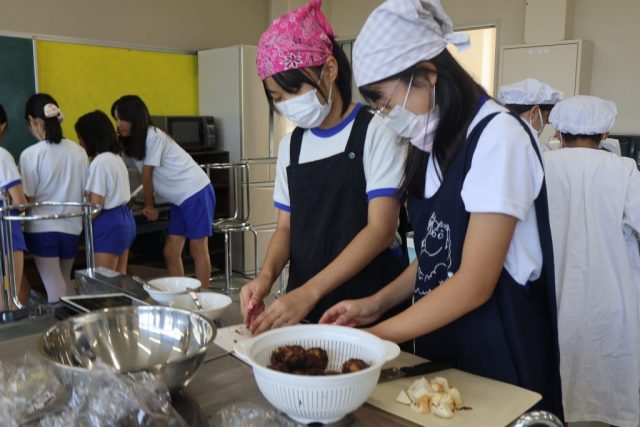 調理を始めると、里芋の皮をむいている子どもが「終わらない」「33人分大変」と話しました。また、「99個おにぎりつくるの手伝って~」という声もあがりました。