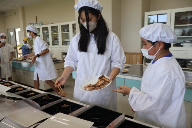 調理が終わった班から盛り付けをしていきました。どこに盛るか、どのように盛るかを考えながら行っていました。