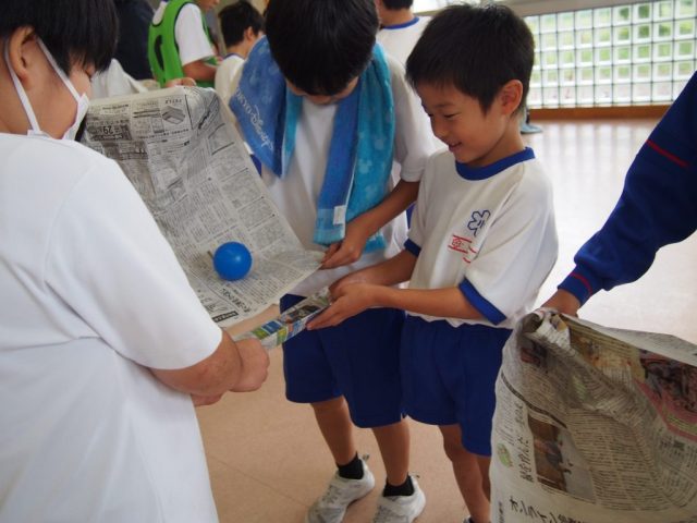 仲間と実際にゲームをやってみることを繰り返し、ルールについてもみんなで話し合って進めていきました。声をかけ合うゲームとして、新聞紙でボールを受け止めてリレーしていく「こえをかけあうしんぶんボールキャッチ」をすることに決まりました。