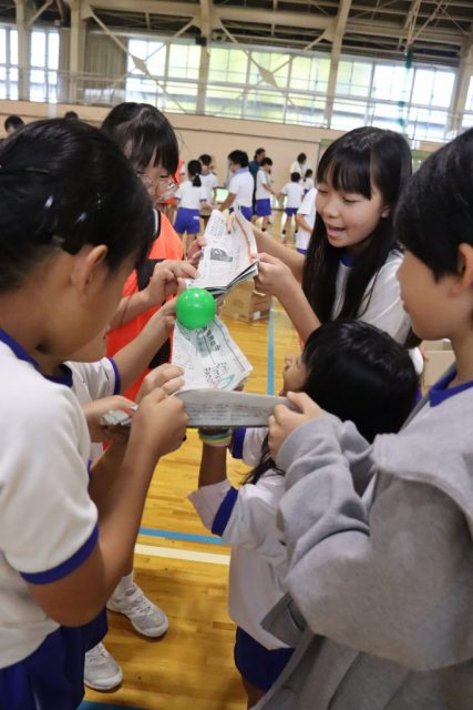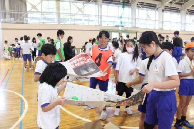 教室で、10月のふれあいデー・ふれあい集会について話すと、様々なゲームにつくり変わっていることが話題になりました。「新聞紙でボールを投げた」「細長くして滑り台にした後、トンネル型にした」「たたんで小さくした」「破いて小さくした。班長がして、小さくて難しいのにしたいんじゃないかなと思った」「新聞紙に穴を開けた」などと話しました。また、「サッカーになっちゃった」と話す子どももいました。