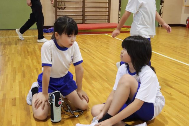 前日、子どもは、今回のテーマである「声をかけあうこと」について話しました。1年生の企画であることから、1年生がゲームの説明を上手くできるか、ゲームがなかなか始まらないのではないかといったことを話しました。教師から、「ゲームの説明が上手くできない時やゲームが始まらない時、どんな声をかけるの」と尋ねられると、「『大丈夫』と声をかける」「最初のステージでのゲーム説明をよく聞いておく。それを伝える」「とりあえずやってみる」「周りのチームの様子を見て、やってみる」などと話しました。