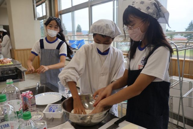 子どもは、大量の食材を手分けして切り、準備をしました。エリンギをベーコンで巻いてフライにすることやフルーツポンチに白玉を入れてゼリーにしようと考えた班は工程がたくさんありました。早く調理が終わった班に手伝ってもらいながら調理をしていきました。