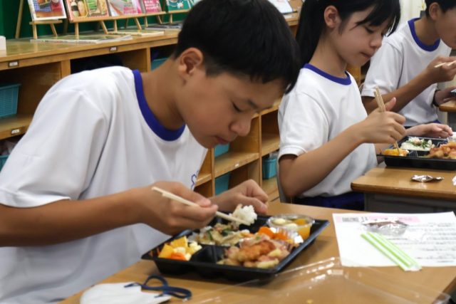 「今日、6-1のお弁当二回目の試食をしました。とちゅう、きのこが多すぎたりなべがたりなかったり、いろいろなハプニングがありました。作りおわってさっそく食べてみました。ごはんが岡田先生に言われたとおり味がうすくて、あげものとあってよかったです。全体のバランスもよくて試作一回目はほぼ茶色だったけど、今回はいろとりどりでみためもとってもよかったです。話をきいて少しごはんがうすいと言っていたのでもうすこし味をこくしたいです。自分的には、あげものが少しおおかったと思います。」