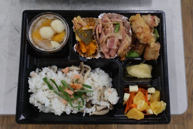 主食は、「紅鮭としめじの炊き込みご飯」、主菜は「上越の海!さめの唐揚げ」「自然の恵みとベーコンのエリンギ巻きフライ」「地元の食材を使ったベーコンゆず胡椒焼き」の3種類、副菜は、「バナナかぼちゃ&ベーコンサラダ」「美味しいよ美味しいよ人参サラダ美味しいよ」の2種類、デザートは「上越旬彩 色とりどりなフルーツポンチ」に決まりました。