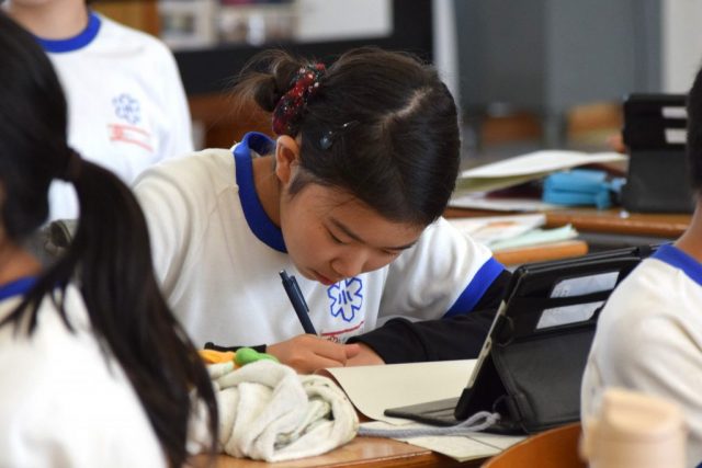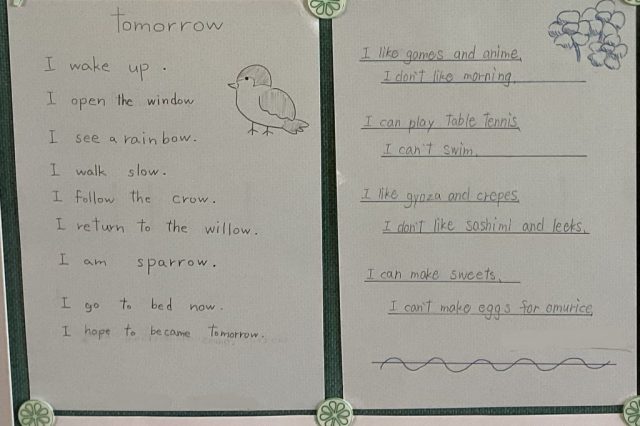 10月17日と21日に子どもは、他国に住む日本に興味のある方や住んだことのある方に協力を得て、詩のやりとりをすることを聞きました。初めて書く英語詩のテーマは「Who I am」です。子どもは前回出あった詩や、教師がつくった詩を参考にしながら詩をつくり始めました。