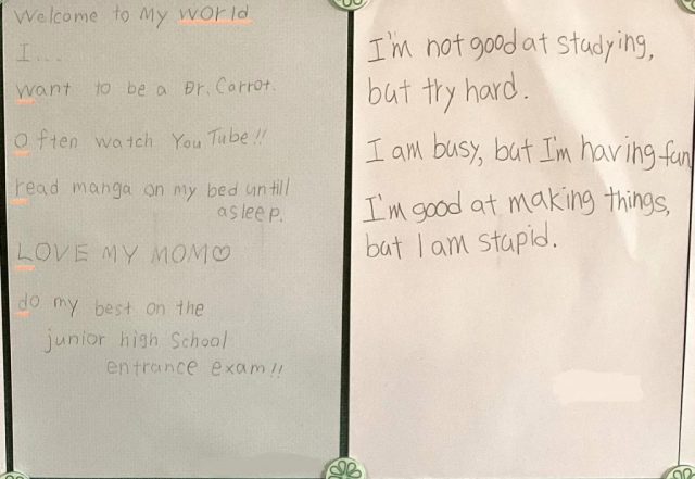 子どもは振り返りに「詩をつくるときに気をつけたのは、自分の苦手なことと自分が好きなことを順番に書いたことです。自分はこんなことが苦手だけど、こういうことが好きだよって感じで書きました。」「詩をつくるときに気をつけたことは、文末にerをつけることです。あと、区切られているところ(区切られているところ)の最後にもerをつけたりして、テンポよくウキウキな感じで読めるようにしました。それから文ごとに書く色を変えたりして、楽しく、明るい感じで読めるようにしました」などと書きました。