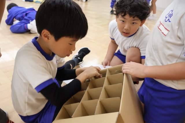 座って演奏することや側面に穴があいていることに驚いたり、教師がたたいた時の音を聴いて「太鼓みたい」と話したりしました。5つの段ボールでつくられたカホンをたたいたり、中を見たりしながら、中につけるしかけやたたく場所によって音が変わることに面白さを感じました。