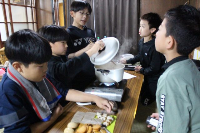 夕食には、おでんとサツマイモご飯を作りました。ここで使ったサツマイモも、古民家の庭の畑で採れたものです。子どもは、「古民家で食べると、すごいおいしく感じる」と話したり、たくさんおかわりしたりしていました。