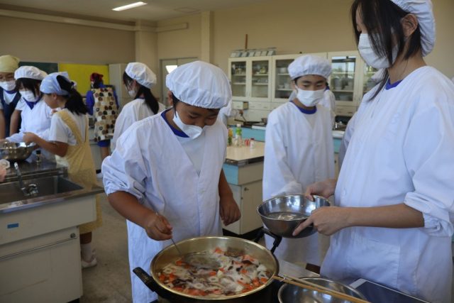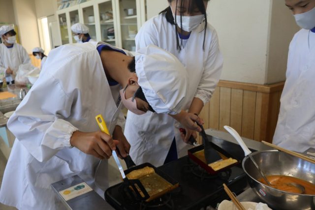 子どもは、3回目の試作を手際よく準備しました。郷土料理であるのっぺをつくる子どもは、「たくさん具材を切ったね」「だし汁のにおいがおいしくなさそう」などと話していました。また、初めて卵焼きをつくる子どもは、「上手に巻けた!」と喜んでいました。