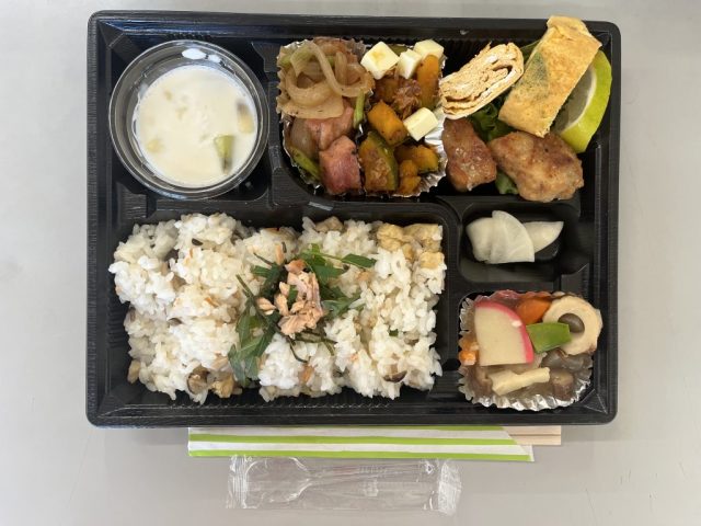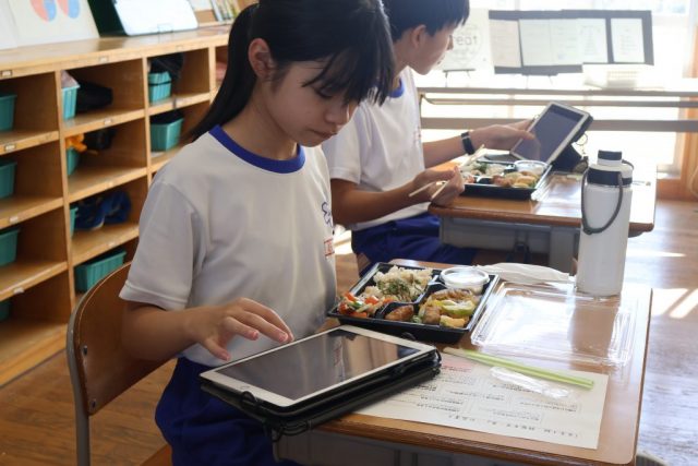 みんなで盛り付けをし、お弁当が完成しました。お弁当を食べながら、子どもはアンケートに答えて、感想を書きました。