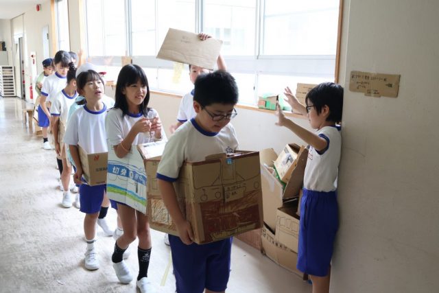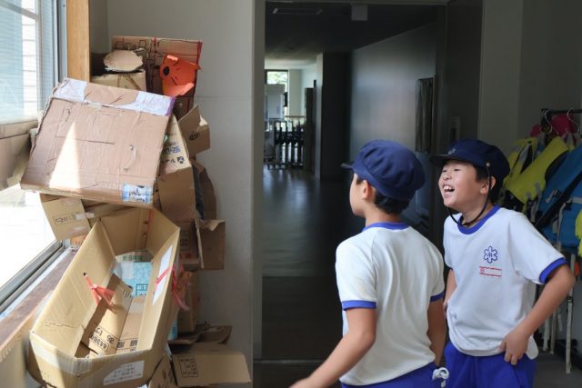 廃車にするダンボール電車を積み上げた子どもは、「電車タワーができた!」とつぶやき、仲間を呼びました。すると、積み上げた電車を見た子どもは、「このタワーを観光スポットにして、ここに新しい駅をつくろう」と話しました。