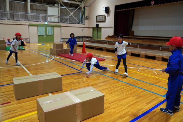 子どもは、チャレンジャーとしてゴム紐を避けながらゴールを目指したり、ブロッカーとして相手の進行を阻んだりすることを楽しみました。