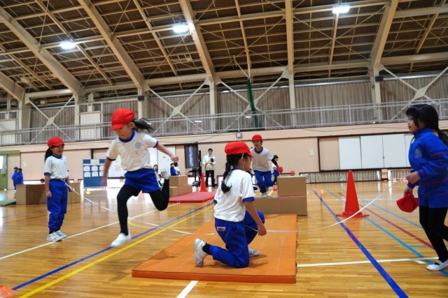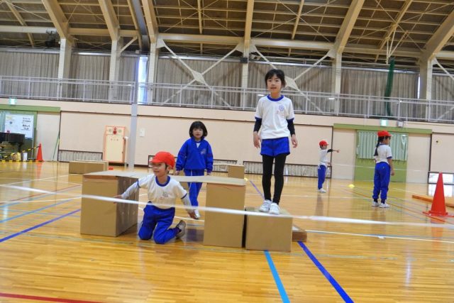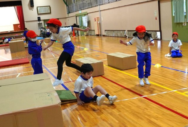 〇だいのうえからジャンプ・・・台の上からジャンプし、そのままゴム紐を越えたり、ゴム紐を踏んだりする。