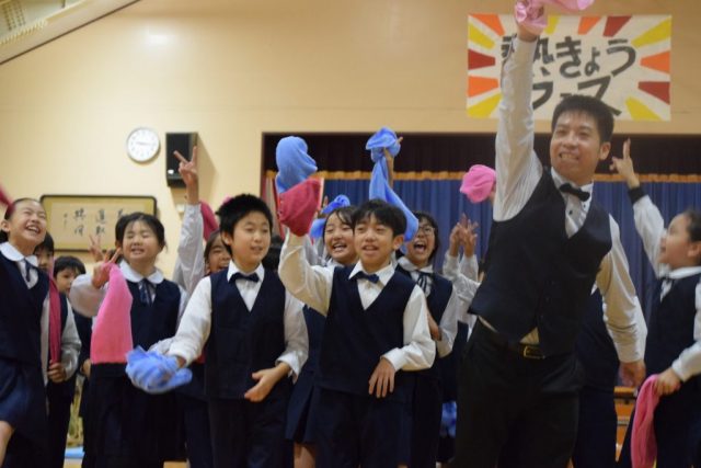 5年2組の学級パフォーマンスでは、「大町 熱きょう 超最高」と「5年2組 大町go」という掛け声を他学級の仲間にしてもらいたいと考え、はっきりと大きな声で言うことを大切にしました。