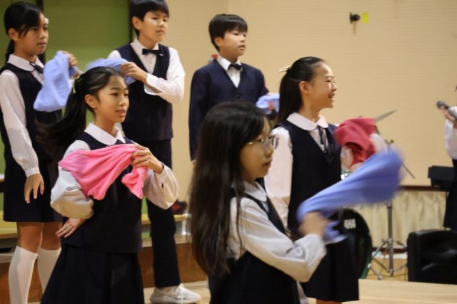 教室へ戻り、秋の音楽集会について話すと子どもは、「のどがすごく乾いた。熱きょうした証拠」「6ー1の『もっと』で共にはじけられた」「私と先生で声を勝負した」「3-2、2-2も盛り上がっていた」「見ている人からも声が聞こえて嬉しい」などと話しました。
