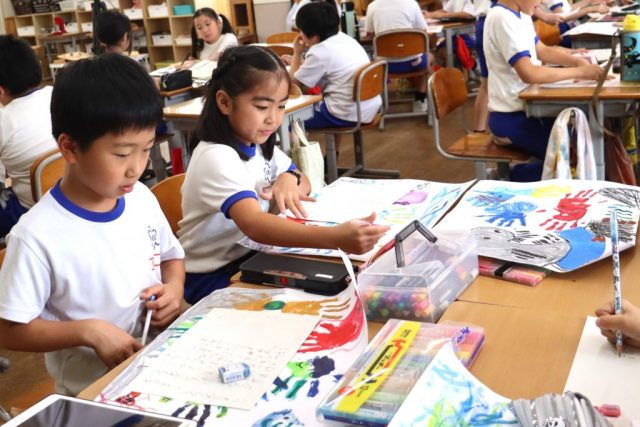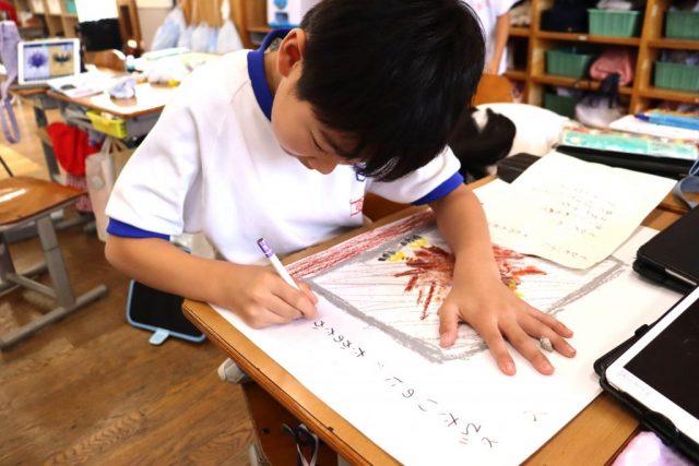 実践国語科「手のひら生き物詩」では、自分の手や指に絵の具を付け、画用紙にスタンプした手形を水中生物や動物に見立てて詩を書く活動です。