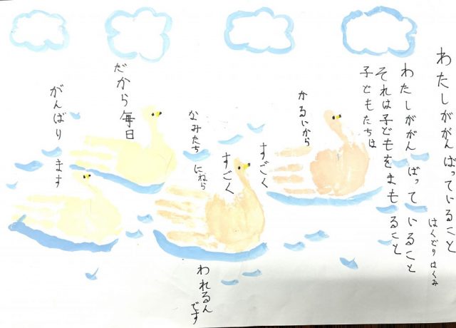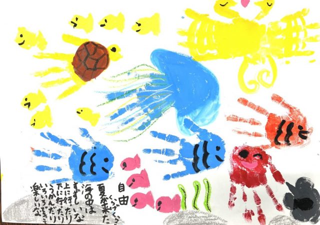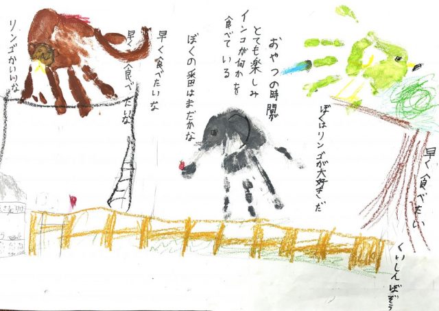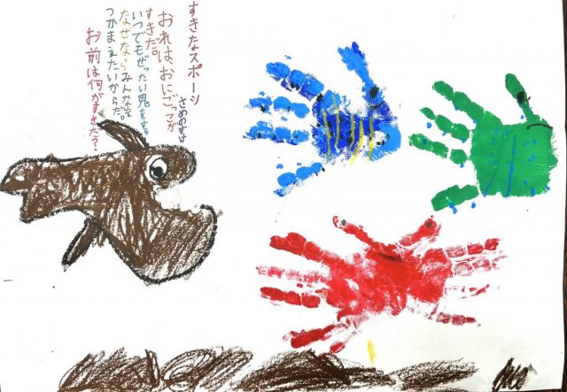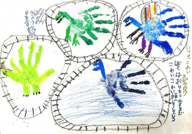 そして、子どもは自分の手形をスタンプした画用紙を見つめながら、どの生き物になるきるのか考えました。