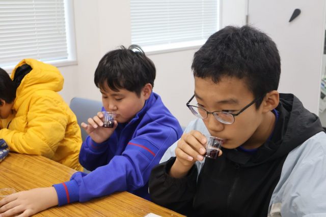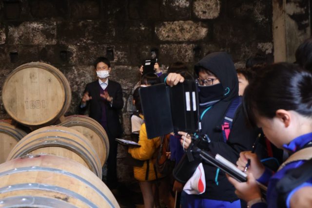 まず、岩の原葡萄園で育てている品種と同じブドウを使ったブドウジュースを2種類いただきました。飲んだ瞬間、味の違いに気付いた子どもは、「こっちは甘い。こっちは酸っぱい感じかな」と言いました。この2種類だけでなく、岩の原葡萄園で育てているブドウの品種を作った川上善兵衛さんや岩の原葡萄園の歴史について、渡辺さんよりお聞きしました。岩の原葡萄園ができたのは川上善兵衛の力が大きく、「自分のためではなく、他人のために働いた」ということに疑問と、思いを湧き上がらせていました。雪が多く降る地域ではあまりブドウ栽培をしていないということで、子どもは「この世に1つだ」とつぶやいていました。その後、創業以来使われている石蔵、雪を使用した雪室を見せていただきました。どちらもひんやりとしたその場所だからこそ、ワインが守られているのだと感じたようです。