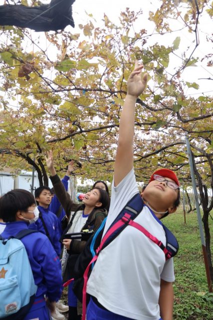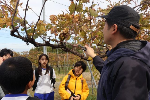 短梢仕立てと長梢仕立てがあり、長梢仕立ては子どもが背伸びをしてギリギリ届くところに枝が伸びていました。このつくりは、雪の多く降る地域だからこそのつくりであることをお聞きし、雪からは守られるが作業の大変さがあるということを感じていました。