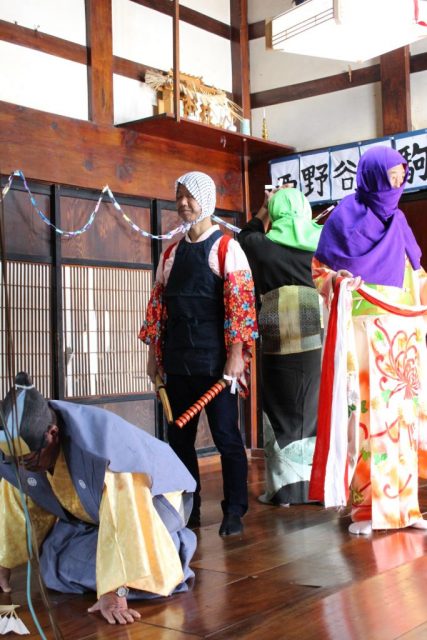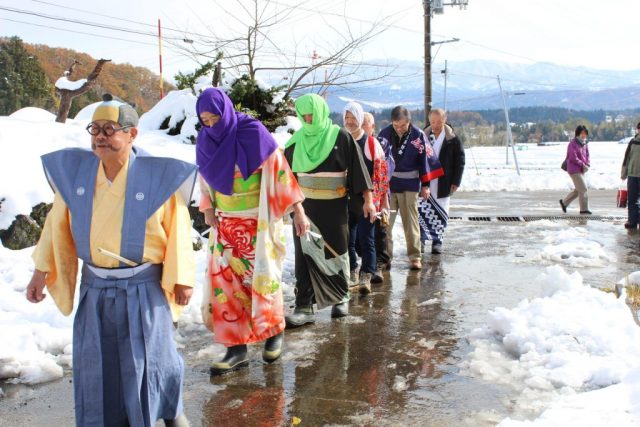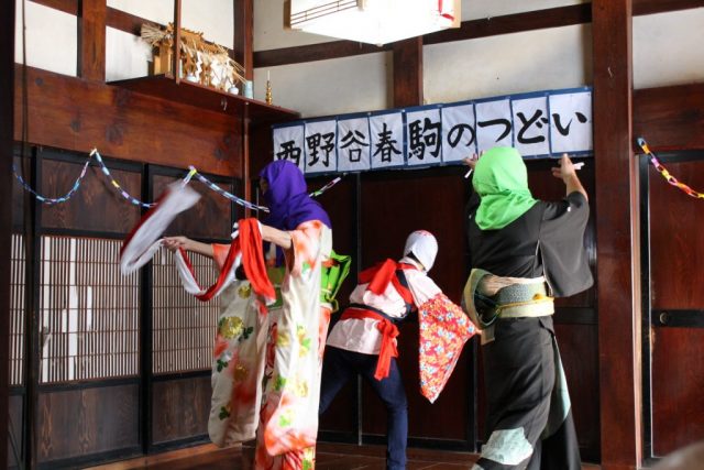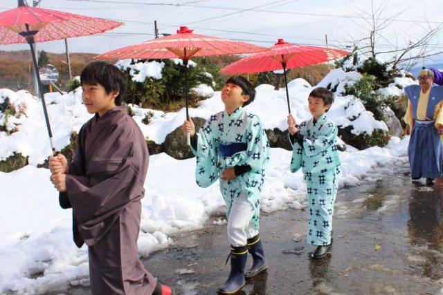 前日の夜は西野谷に雪が降りました。古民家の庭先に雪が残る中、「春駒」の踊り手や弾き手の方々を、近迎え(ちかむかえ)の役の子どもが、和傘を持って古民家に招き入れました。歌い手の方の、艶のある朗々とした歌声が響き渡り、「春駒」の世界観がひろがっていくようでした。