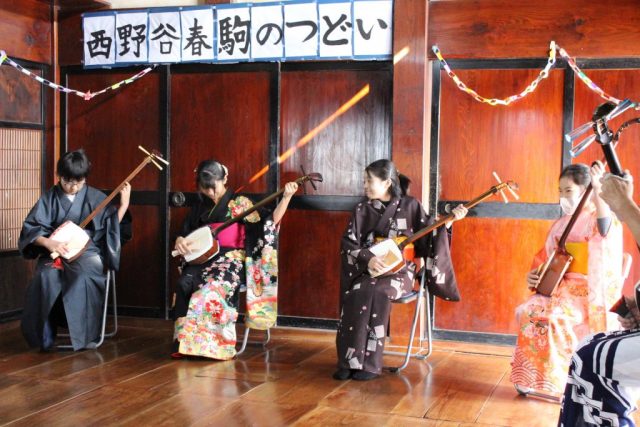 「西野谷 春駒の集い」では、三味線を弾く4人の子どもが前座を務めました。三味線の師匠である佐藤さんに教わるとともに、自分たちでも繰り返し引いてきた「さくらさくら」を披露しました。集まってくださった西野谷集落の方々が、目を見張りながら、ときには頷きながら真剣に聴いてくださいました。
