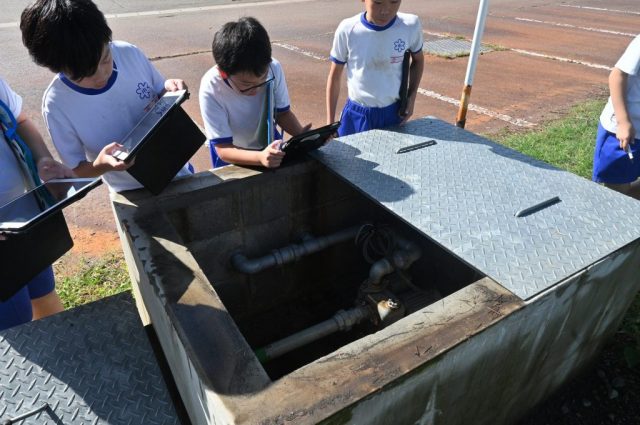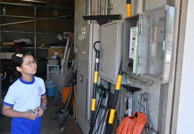 また、どこから出ているのか、どうやって出るのか気になった子どもは近くにいた用務員さんに尋ねました。すると「出るのはここだよ」と水が出る場所や、「ここにあるセンサーで雪や温度を感知して、水が出始めるんだよ」と消雪パイプの仕組みを教えてもらい、雪にそなえる道具について知りました。