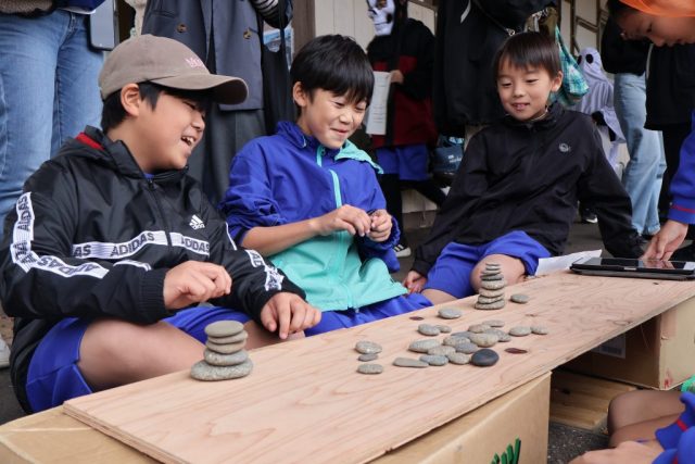子どもは、これまでつくってきた電車を谷浜駅で走らせたり、谷浜海水浴場で拾った石を使って石ジェンガをして遊んだりしました。