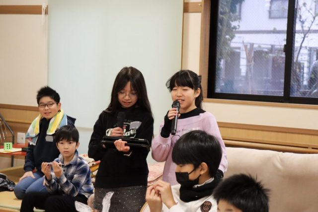 開始3分前になると2人の方から玄関に来ていました。その後、さらに会場に訪れる人が増えていきました。時間になり、「4丁目のお茶会!!」が司会の子どもによって始まりました。