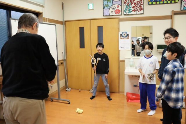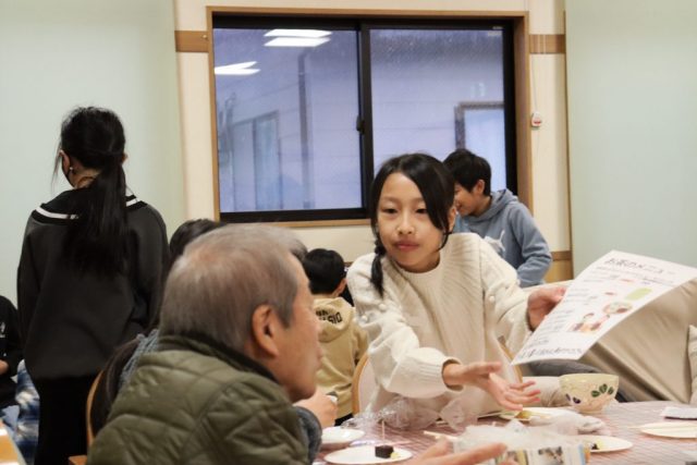 子どもは4丁目の方に「お菓子は自分たちでつくった」と話すと、4丁目の方は驚いていました。また、「栗羊羹が上手だね」と褒めてもらいました。お茶の注文をとる子どもは、4丁目の方に「5年生全員ここにいるの?」と聞かれ、その後学校のことや昔の様子について話題が膨らみました。