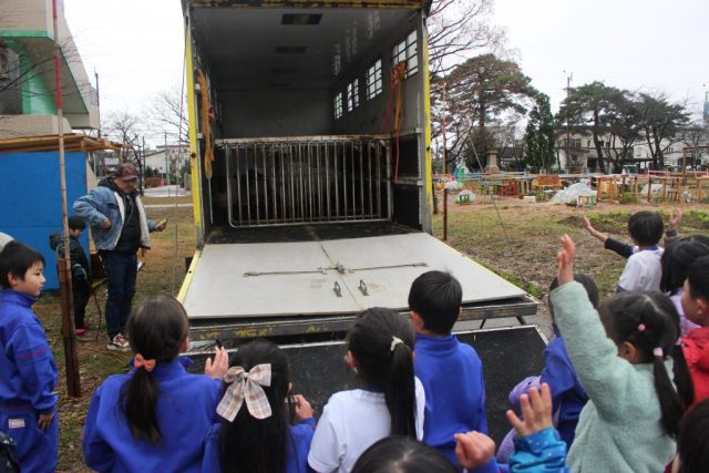 スエトシ牧場の藤原さんが到着しました。藤原さんにこれまでのヒツジとの思い出について話した後、一緒に原っぱのひつじふれあいランドを見に行きました。藤原さんは、「ヒツジがとても大きくなったねえ。どの子がなんて名前?」「柵がものすごく大きいね!」と話され、子どもは答えていました。ひつじふれあいランドで過ごした後、子どもは、「最後にもふのリードを持ちたい」そう言いながら仲間とヒツジのリードをトラックまで引っぱりました。もふはすぐにトラックに乗りましたが、三つ子の子ヒツジはなかなか乗ろうとしませんでした。リードを引っぱったり、仲間と壁を作ったりしながら時間をかけて子ヒツジをトラックに乗せました。ましゅまろ、ろこん、最後にめるる。順番にトラックに乗り込みました。なかなかトラックに乗らない子ヒツジの様子を見て、「三つ子は寂しいのかもね」「まだ学校にいたいのかもよ」「初めて見るトラックにびっくりしているのかな」「これで本当にお別れなんだね」と、子どもは話しました。最後に、トラックの中のもふたちにそれぞれが言葉をかけ、藤原さんにみんなでお礼の言葉を言って、トラックが出発していきました。子どもはトラックが見えなくなるまで、手を振り、ヒツジさんとお別れをしました。大声で泣く子、残ったリードをにぎりしめる子、仲間と思い出を話す子、様々な子どもの姿がありました。