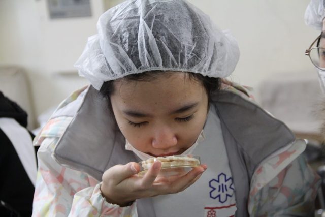 君の井酒造に着くと、子どもはヘアキャップをかぶり、手を洗い、杜氏の早津さんより日本酒の製造工程を教えていただきました。部屋の中では大きな機械が動いており、お米が蒸し上がっていました。子どもは一口ずつ蒸されたお米をいただきました。いつも食べているお米よりも固いことや小さいこと、そしておいしいと話していました。2階に降りると丸い口がいくつも並んだ部屋があり、1階には仕込みタンクがたくさん並んでいました。その仕込みタンクの中でお酒がつくられていました。