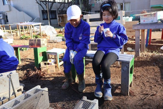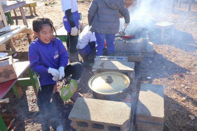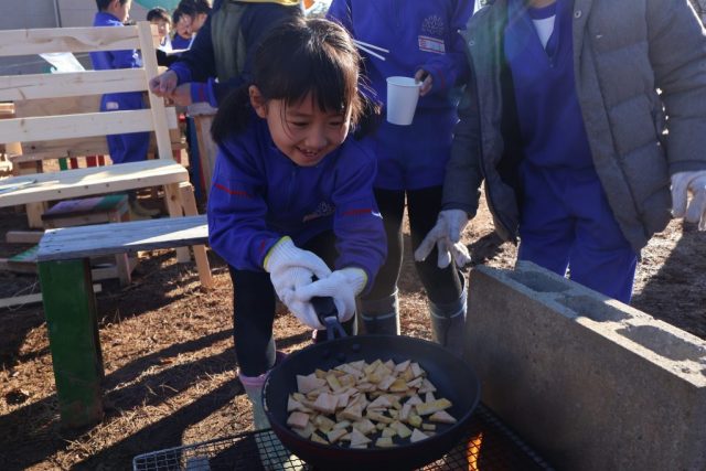 12月19日、久しぶりの晴天に恵まれて、「火起こしをしたいな」「サツマイモを料理したい」という子どもが2学期最後の料理を始めました。