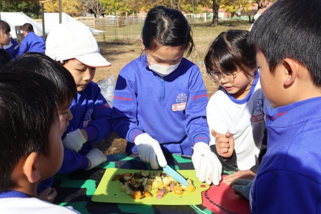 創造活動「らんまん農えん」では、これまでに何度か料理を作ってきました。子どもは、みんなが食べられるようにしたいと、味噌汁やスープを紙コップに分けて全員が手にするまで食べるのを待ってもらったり、ピザを人数分に切り分けるまでずっと待ち続けていたりするなどしていました。